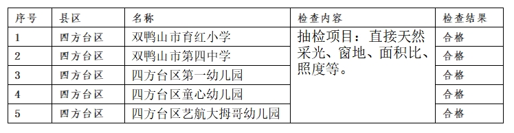 按照省疾控局、省教育厅、省卫生健康委联合印发的《关于开展2025年托育机构、幼儿园、校外培训机构、学校采光照明“双随机”抽检工作的通知》要求,2025年9月-10月,四方台区疾控中心(卫生监督所)、区教体局联合开展对辖区内幼儿园、学校5家单位的“双随机”抽检工作,现将检查结果公示如下: