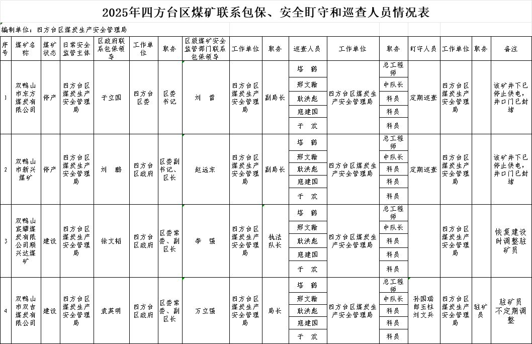 2025年四方台区煤矿联系包保、安全盯守和巡查人员情况表