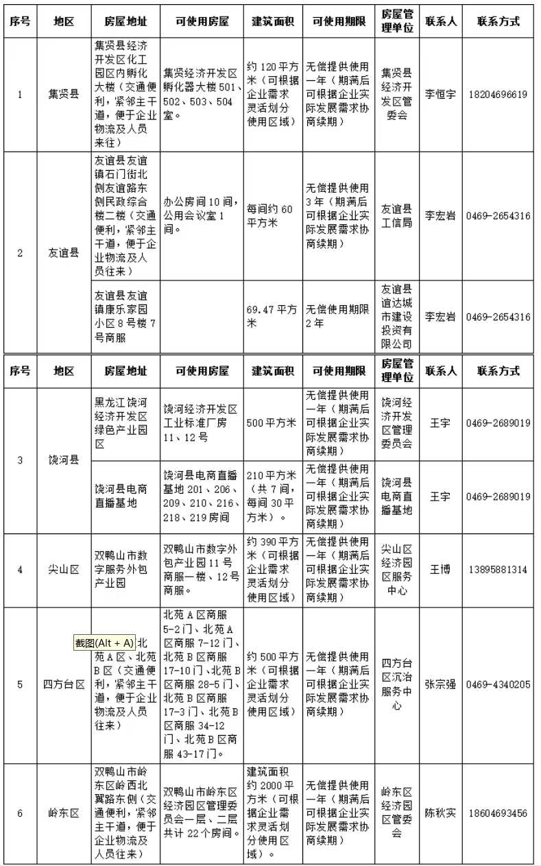 双鸭山市各县区政府企业住所无偿使用信息表