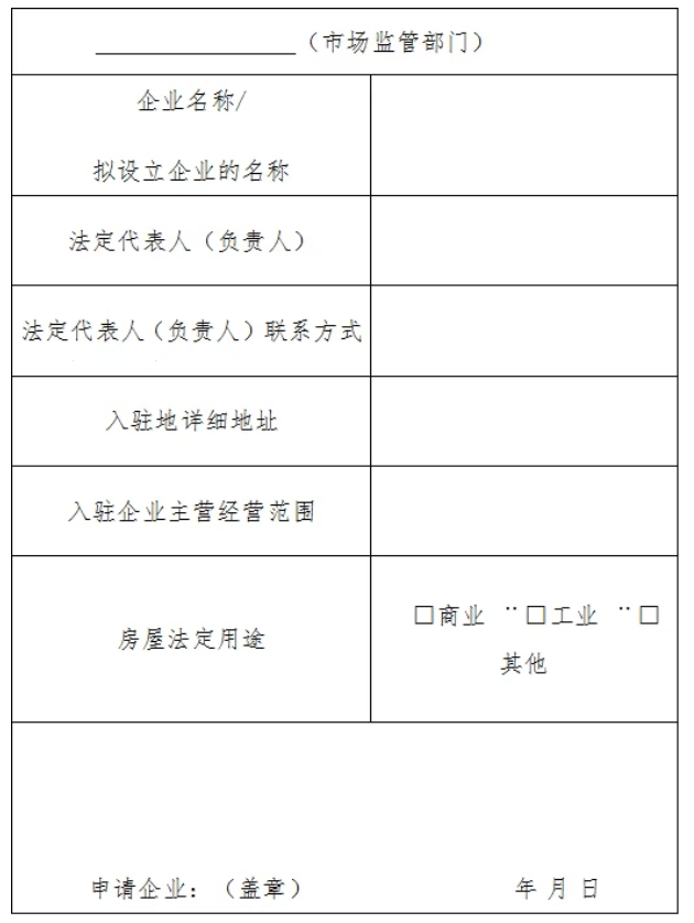 (一) 提交申请。有意向的企业填写《企业入驻申请表》(附件2),并携带营业执照副本复印件、法定代表人身份证明等材料,向房屋所在市场监督管理部门提交书面申请。