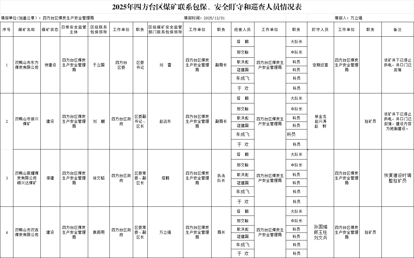 2025年12月四方台区煤矿联系包保、安全盯守和巡查人员情况表