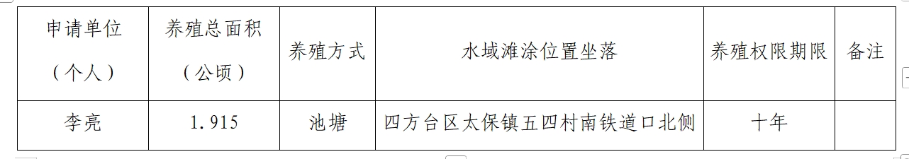 根据农业农村部颁发的《水域滩涂养殖发证登记办法》(农业农村部令2010年第9号)的要求,太保镇四五村李亮申请办理《水域滩涂养殖证》,经审核符合发证要求,现予公示,公示时间为10个工作日,对公示内容如有异议,请及时与我局联系,联系电话:0469-4340090。