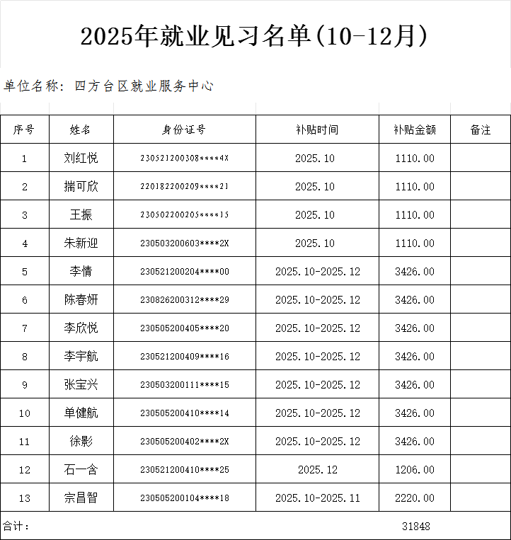 四方台区2025年四季度申报13名见习人员享受见习补贴,经审核13名见习人员符合申报条件,补贴金额共计31848元,见习人员名单予以公示并接受社会监督,公示期为5个工作日(2026年1月6日-2026年1月12日),公示期内如有问题反映,请拨打0469-4349633。