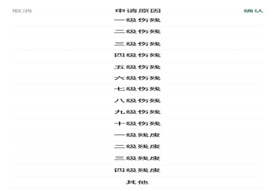 郑重提醒:在申请原因里选择下图中的伤残等级或者残废等级(最新《兵役登记工作规定》明确:政府有关部门对依照法律被剥夺政治权利的公民,应当作出不得服兵役的结论;对被鉴定为一级至四级伤残或者完全丧失劳动能力,或者被评定为一级至三级残疾等级的公民,应当作出免服兵役的结论。)