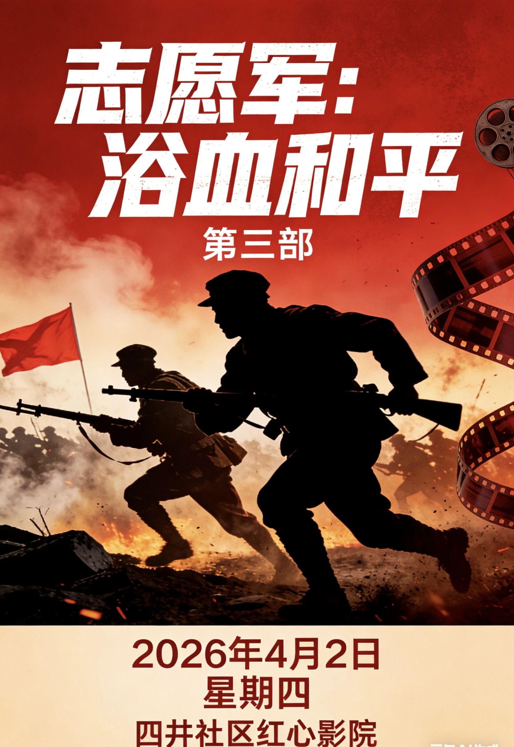 3.红色观影活动:义诊结束后,群众可在四井社区红心影院免费观看红色电影《志愿军:浴血和平》(志愿军系列第三部)。影片全景式展现抗美援朝战争后期的关键战役与谈判历程,重温英雄儿女保家卫国的峥嵘岁月,传承红色基因,厚植爱国情怀。