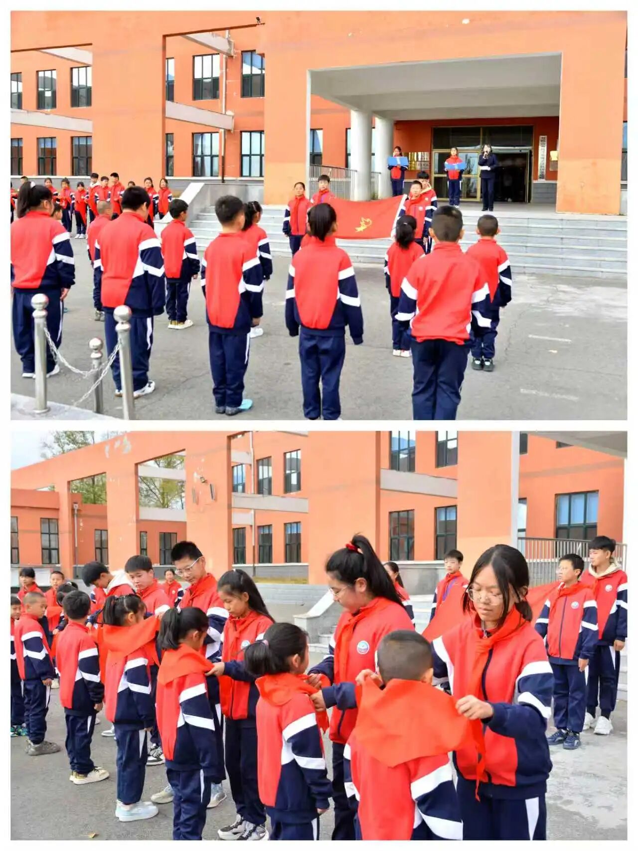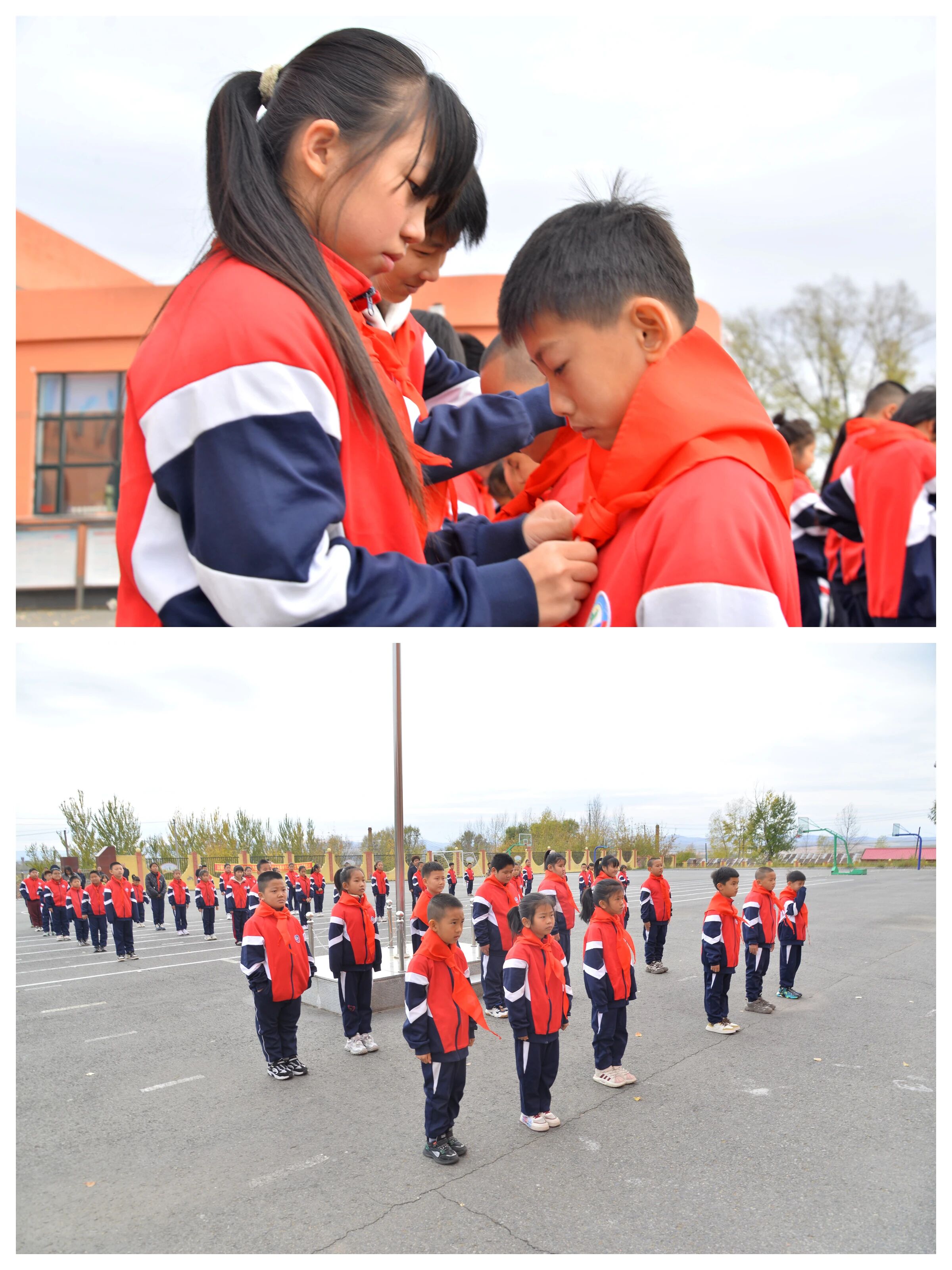 入队仪式在激昂的《出旗曲》中正式拉开帷幕。旗手们迈着整齐有力的步伐,护卫着鲜艳的队旗入场,全体队员肃立,向队旗敬礼,高唱《中国少年先锋队队歌》,歌声嘹亮,响彻校园。高年级老队员手捧红领巾,稳步上前为新队员规范佩戴。鲜艳的红领巾在新队员胸前飘扬,老队员与新队员互敬队礼,完成红色精神的接力传承。“我是中国少年先锋队队员,我在队旗下宣誓……”新队员们高举右拳,用稚嫩却无比坚定的声音,许下了他们与红领巾的第一个约定。这铮铮誓言,回荡在校园的每一个角落,也必将深深烙印在每个孩子的心间。从今天起,他们多了一个光荣的身份——少先队员。