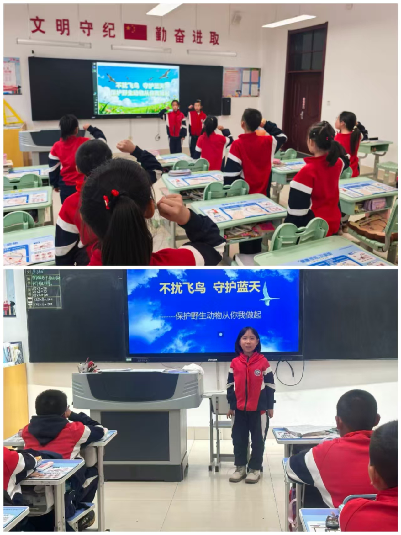 各班组织召开“爱鸟护鸟”主题班会。在班主任的引导下,同学们通过演讲、知识问答、小组讨论等形式,学习了鸟类的基本知识,了解了野生动物面临的生存威胁,以及保护生物多样性的重要意义。班会活动极大地激发了同学们的参与热情,使爱护野生动物的观念成为班级共识。