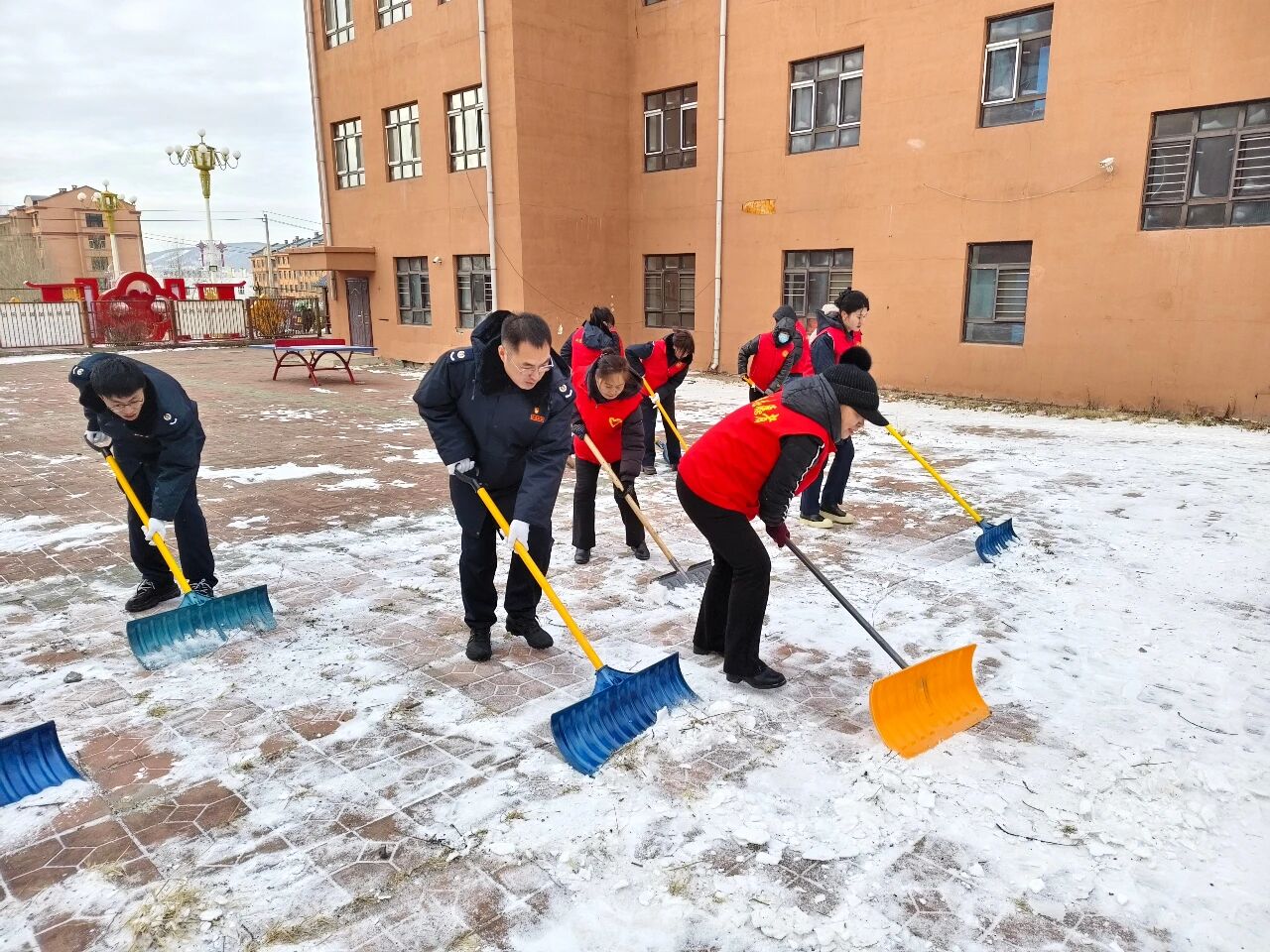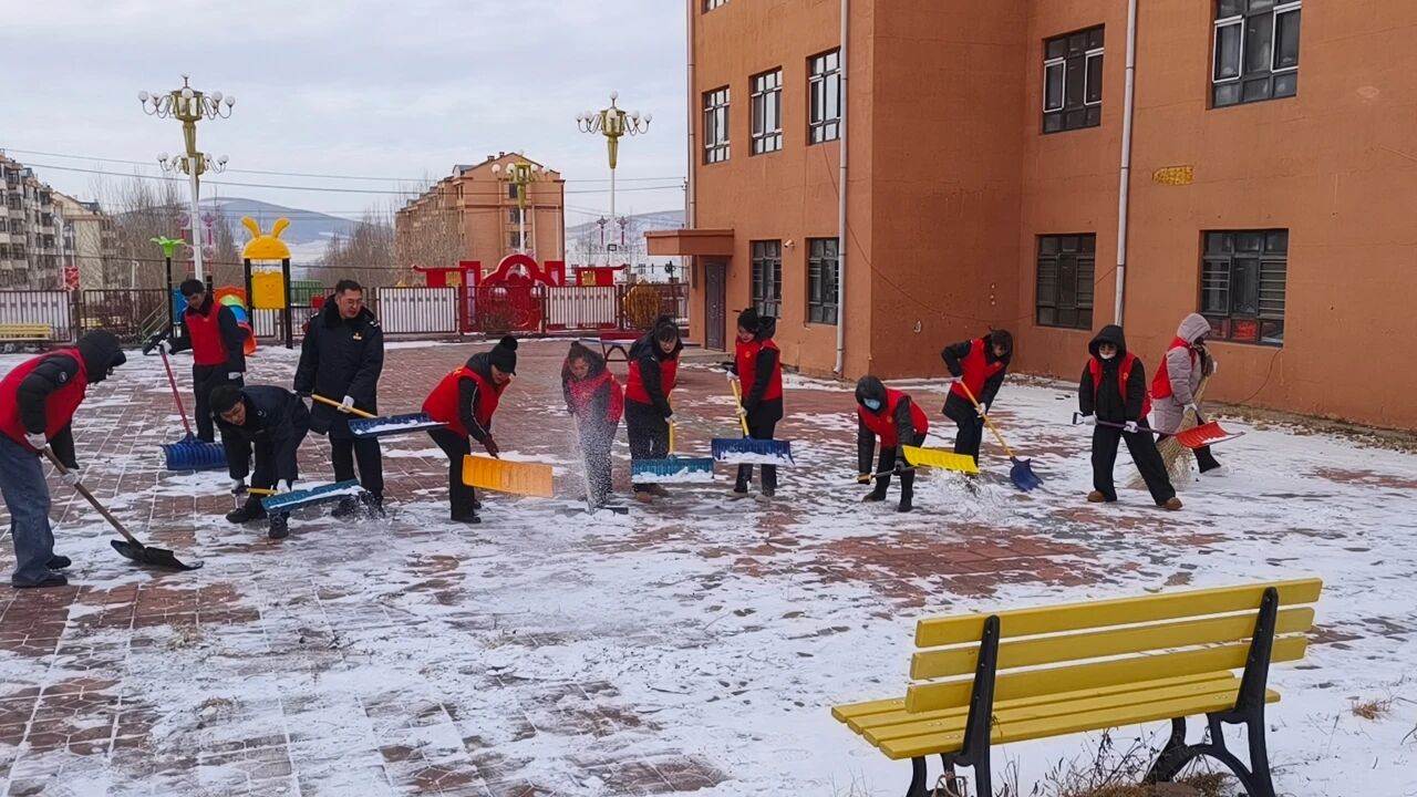 活动当天,志愿者们带着铁锹、扫帚等工具准时集结,迅速投入清雪工作。大家分工明确、默契配合,有的挥舞铁锹破冰除雪,有的手持扫帚清扫残余积雪,不畏严寒、干劲十足。针对小广场出入口、健身器材周边、步行通道等重点区域,志愿者们重点清理,确保无积雪、无结冰,为居民出行和休闲活动扫清障碍。