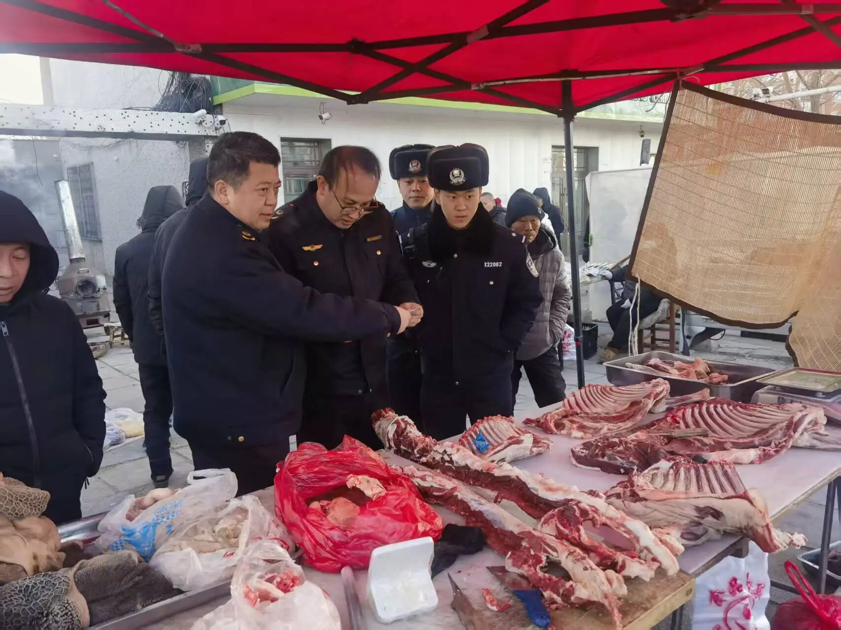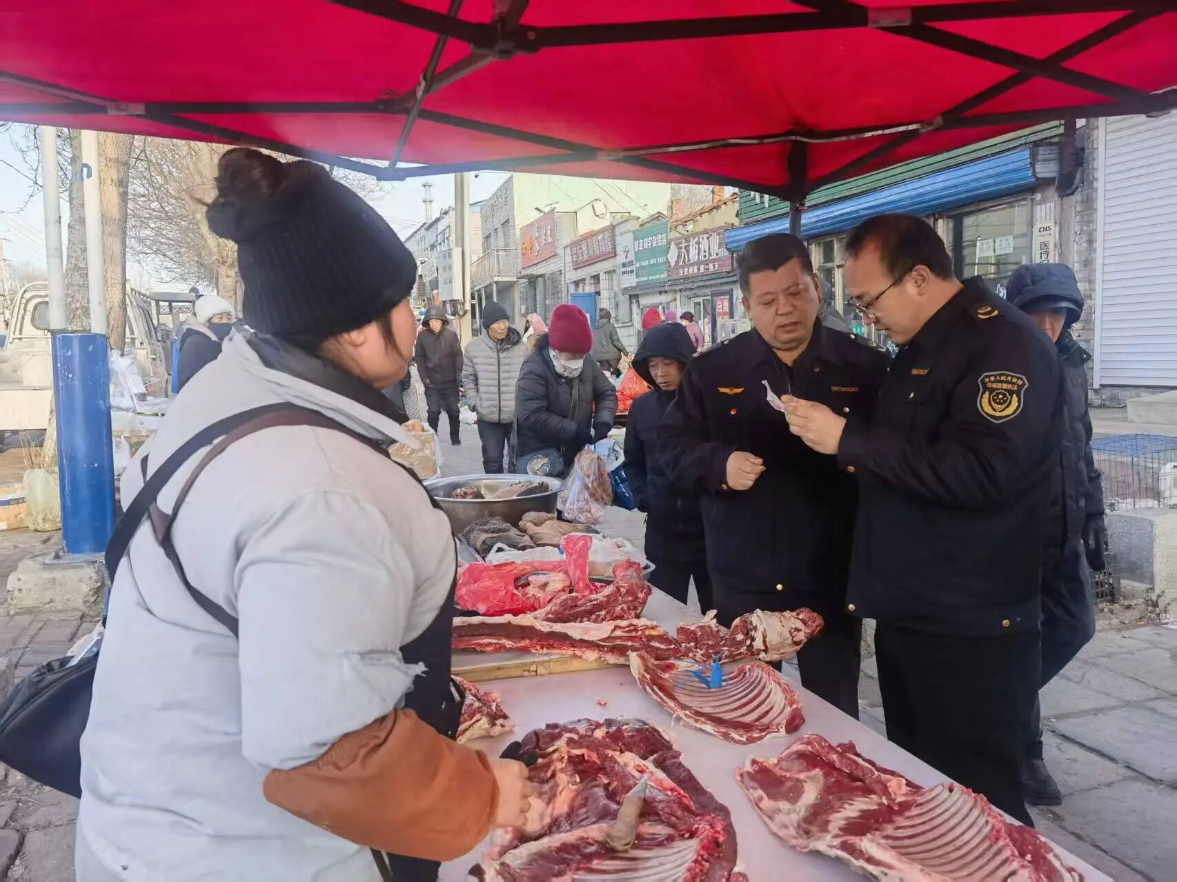 大集是群众日常采购肉制品的重要场所,其食品安全直接关系到千家万户的健康福祉。为切实规范大集肉制品经营秩序,筑牢食品安全防线,近日,由双鸭山市市场监督管理局四方台分局、市公安局四方台分局、动物检疫站组成的联合检查组,对四方台区大集的肉制品经营摊位开展专项监督检查行动,以“监管合力”守护群众“舌尖上的安全”。