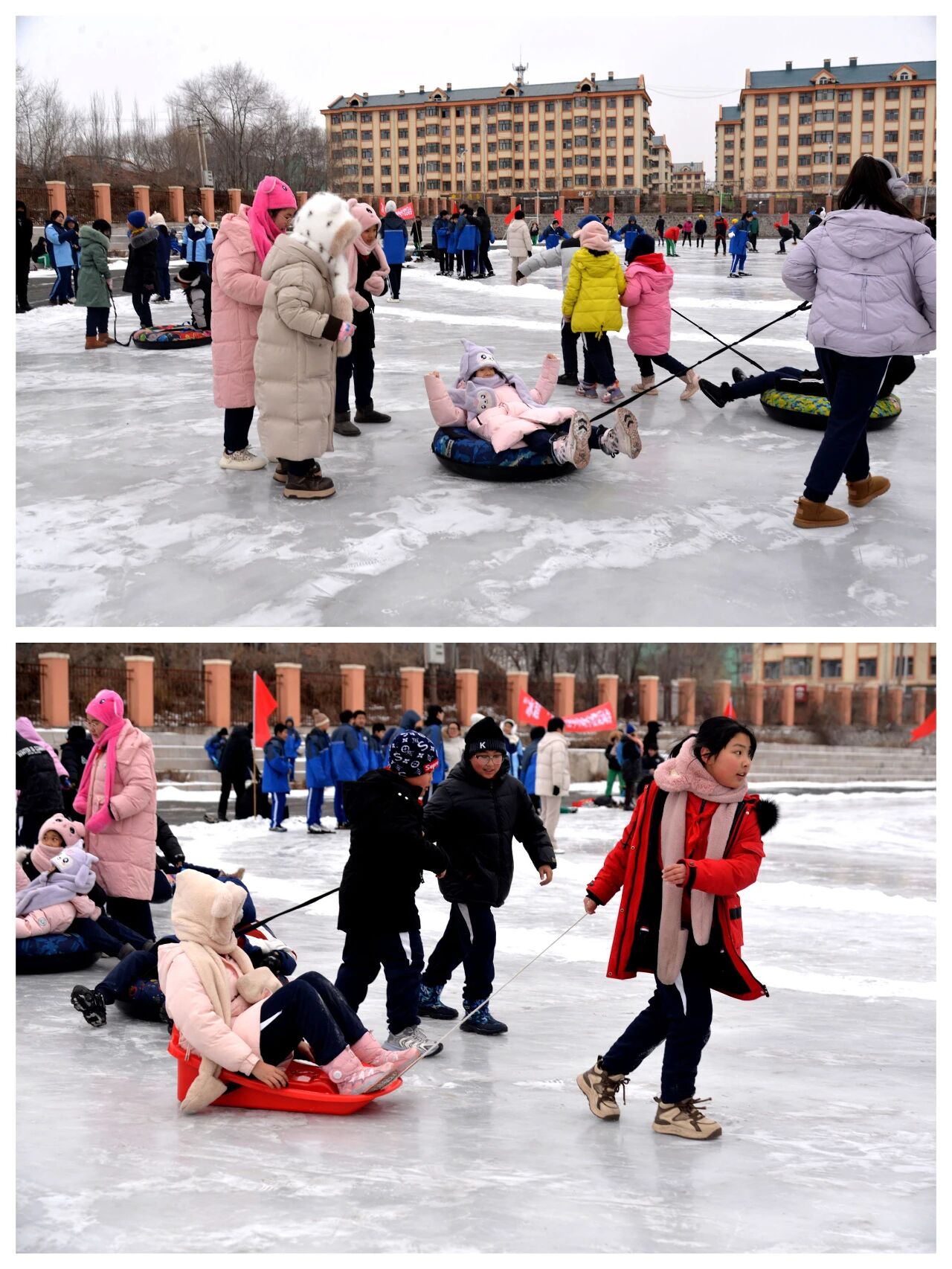 冰面上,同学们玩着各种冰雪游戏,尽情享受着冰雪活动的魅力与乐趣。色彩鲜艳的雪圈成为了孩子们的最爱。他们或是坐在雪圈里,在雪地上滑行,笑声回荡在整个冰场;或是齐心协力拉着雪圈,你争我抢,充满了童真的欢乐。小鞭抽响,冰尜在冰面上飞速旋转。同学们眼疾手快,扬鞭、抽打一气呵成,转得越稳。小小的冰尜转出了冬日的趣味,也转出了同学们们不服输的劲头。