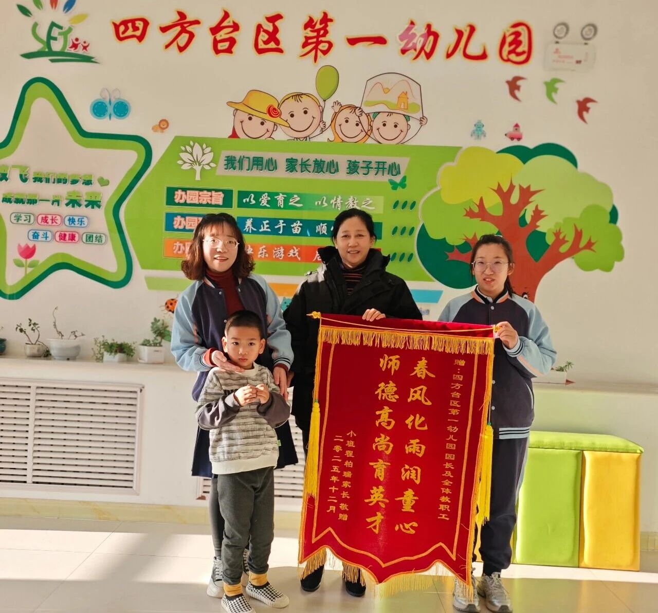 近日,四方台区第一幼儿园小班收到了一份特别的礼物——程柏瑞家长送来一面写有“春风化雨润童心,师德高尚育英才”的锦旗,以此表达对幼儿园园长、全体教职工悉心照料孩子,用心开展教育工作的感激之情。