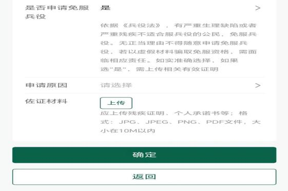 如果身体有生理缺陷或者残疾的,选择“是”,并选择申请理由,上传佐证材料。