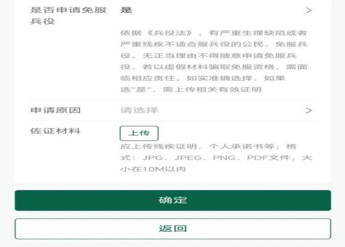 接下来就是2026年新增的一项内容“是否申请免服兵役”,如果身体健康的填“否”,就是符合服兵役条件。如果个人有服兵役意愿,需要在“义务兵征集”菜单里继续申请才能报名参军。