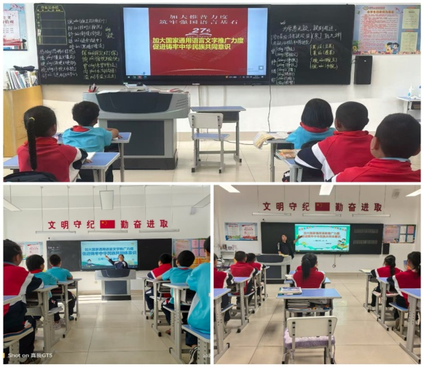 推普周内容丰富,形式多样。活动期间,学校充分发挥语言文字工作主阵地作用,开展了多项特色活动。学校电子屏持续播放着“加大国家通用语言文字推广力度,促进铸牢中华民族共同体意识”推普周主题,张贴推普周海报,营造了浓浓的推普周校园氛围。