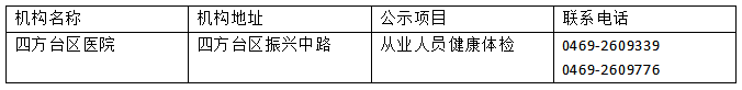 根据双鸭山市卫生健康委、市财政局、市市场监督管理局、市城市管理综合行政执法局《关于进一步做好预防性体检开展从业人员健康检查费用减免工作的通知(双卫联规〔2024〕1号)要求,结合我区实际,现将我区从业人员健康体检机构名单公示如下: